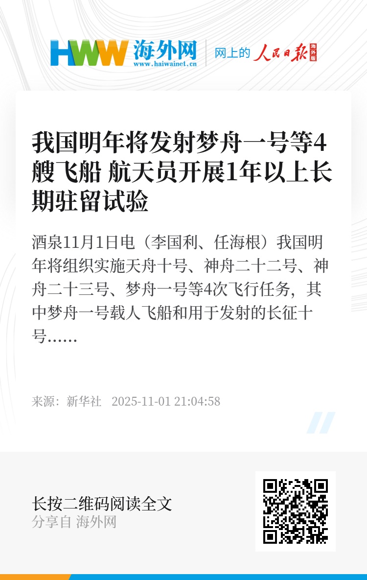 新华社酒泉11月1日电(李国利、任海根)我国明年将组织实施天舟十号、神舟二十二号、神舟二十三号、梦舟一号等4次飞行任务,其中梦舟一号载人飞船和用于发射的长征十号甲运载火箭均为首次飞行。11月1日,中国载人航天工程办公室启动4次飞行任务标识征集活动。