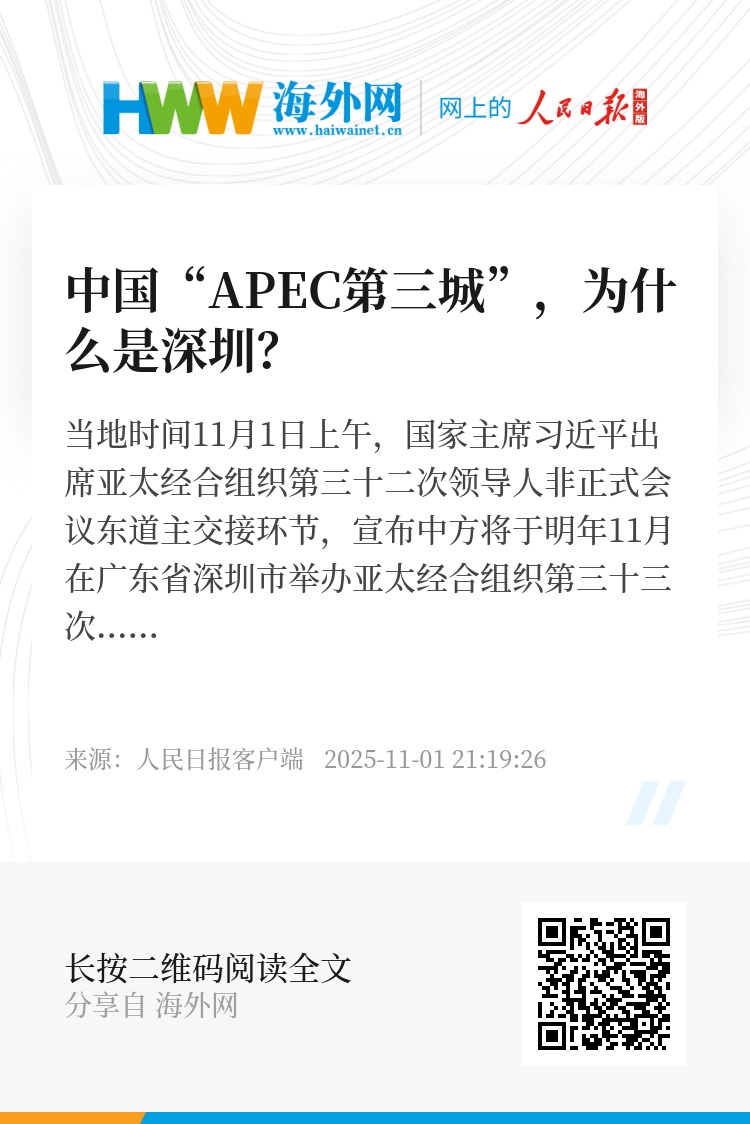 当地时间11月1日上午,国家主席习近平出席亚太经合组织第三十二次领导人非正式会议东道主交接环节,宣布中方将于明年11月在广东省深圳市举办亚太经合组织第三十三次领导人非正式会议。