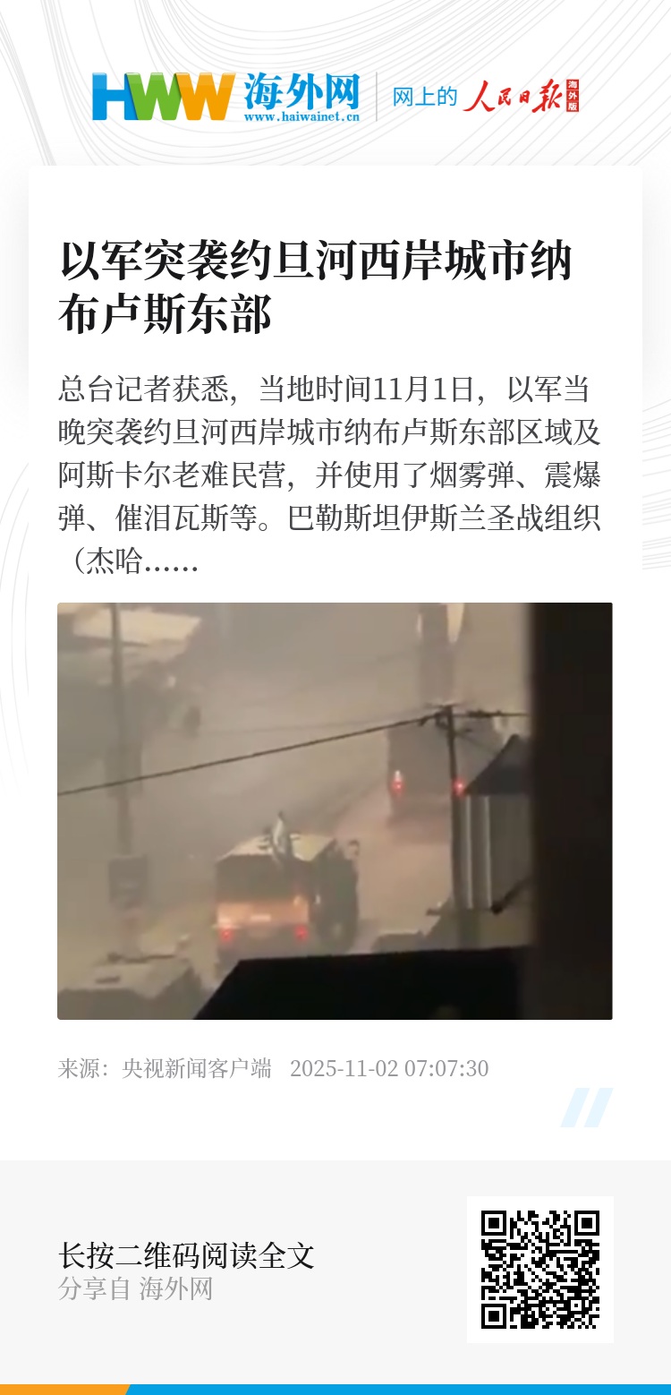 总台记者获悉,当地时间11月1日,以军当晚突袭约旦河西岸城市纳布卢斯东部区域及阿斯卡尔老难民营,并使用了烟雾弹、震爆弹、催泪瓦斯等。