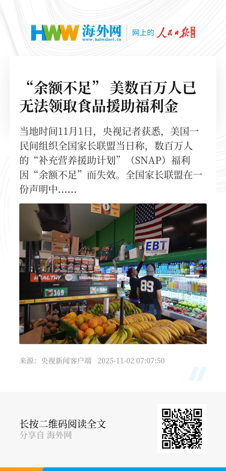 当地时间11月1日,央视记者获悉,美国一民间组织全国家长联盟当日称,数百万人的“补充营养援助计划”(SNAP)福利因“余额不足”而失效。全国家长联盟在一份声明中表示,数百万“补充营养援助计划”的用户当日未能收到福利金。