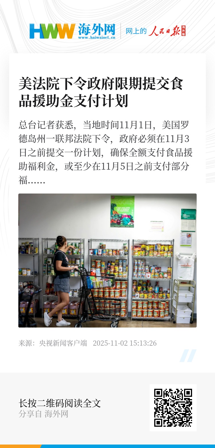 总台记者获悉,当地时间11月1日,美国罗德岛州一联邦法院下令,政府必须在11月3日之前提交一份计划,确保全额支付食品援助福利金,或至少在11月5日之前支付部分福利金。