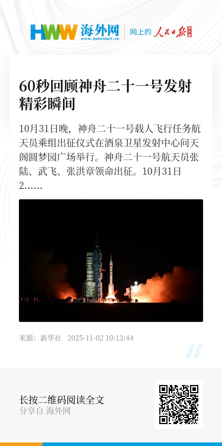 10月31日23时44分,搭载神舟二十一号载人飞船的长征二号F遥二十一运载火箭在酒泉卫星发射中心点火发射,约10分钟后,飞船与火箭成功分离,进入预定轨道,航天员乘组状态良好,发射取得圆满成功。