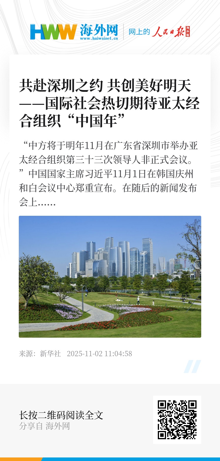 居住在北京的美国企业家盖瑞·德沃切克说,这几天有两个消息让他激动不已:中美元首在韩国釜山举行会晤,以及中国深圳将举办2026年亚太经合组织领导人非正式会议。“在当前世界经贸环境不稳定的背景下,这真是鼓舞人心!”德沃切克说,“中国再次成为亚太经合组织东道主,向亚太和世界发出了积极信号——中国将继续扩大对外开放,推动多边合作,携手各方共促地区繁荣。”