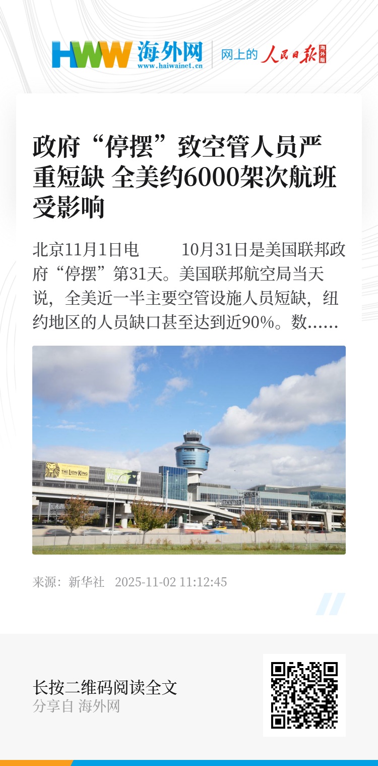 新华社北京11月1日电 10月31日是美国联邦政府“停摆”第31天。美国联邦航空局当天说,全美近一半主要空管设施人员短缺,纽约地区的人员缺口甚至达到近90%。数据显示,全美31日逾5600架次航班延误、500架次航班被取消。