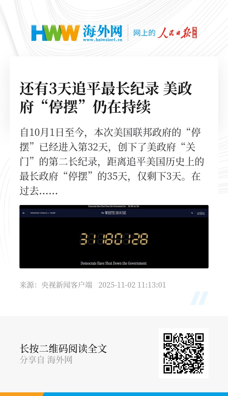 自10月1日至今,本次美国联邦政府的“停摆”已经进入第32天,创下了美政府“关门”的第二长纪录,距离追平美国历史上的最长政府“停摆”的35天,仅剩下3天。