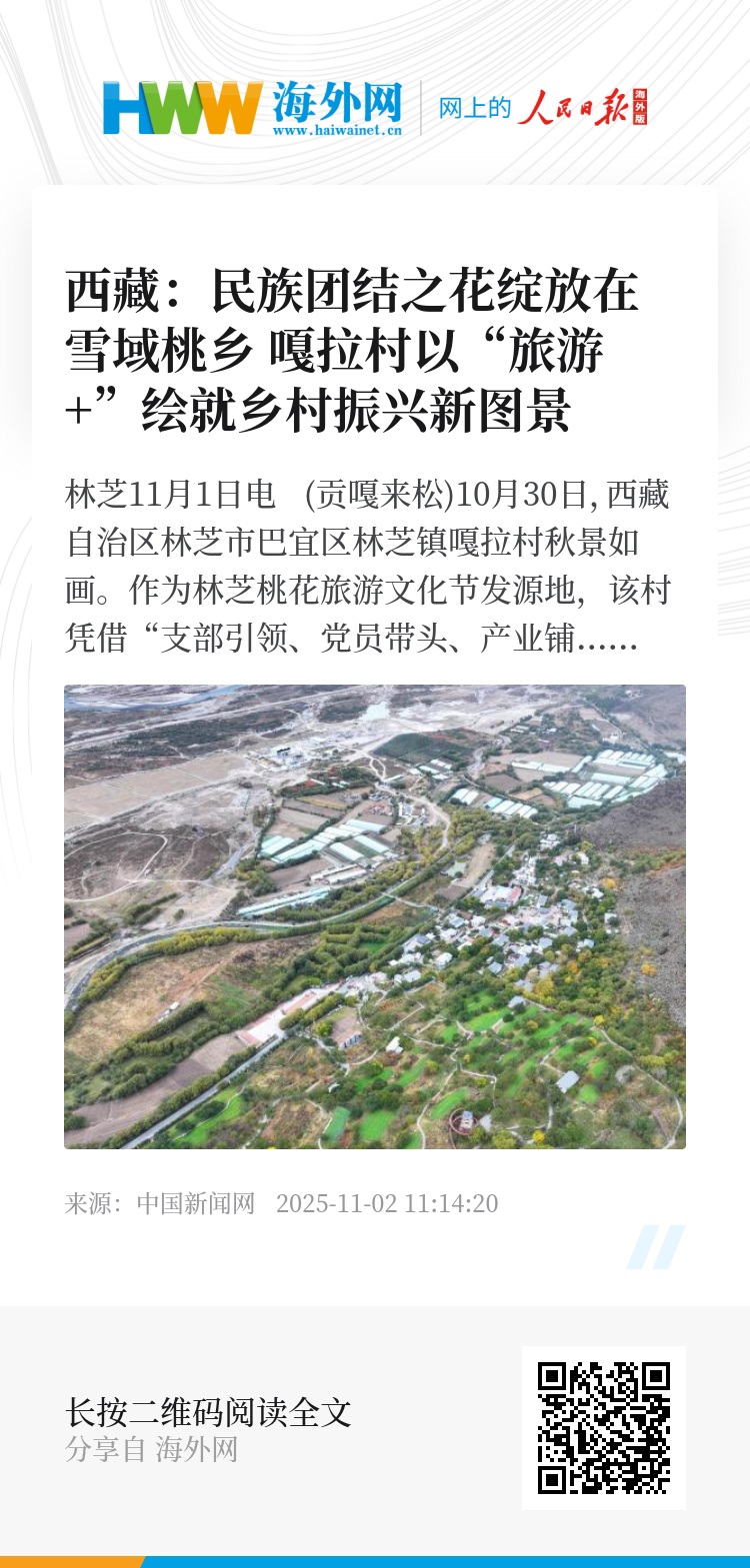 中新网林芝11月1日电 (贡嘎来松)10月30日,西藏自治区林芝市巴宜区林芝镇嘎拉村秋景如画。作为林芝桃花旅游文化节发源地,该村凭借“支部引领、党员带头、产业铺路”的发展路径,让生态颜值转化为经济产值,更获评全国民族团结进步模范集体。2024年,嘎拉村农村经济总收入达1402万元(人民币,下同),人均可支配收入4.12万元,村集体经济收入超700万元,书写了高原乡村振兴的精彩答卷。