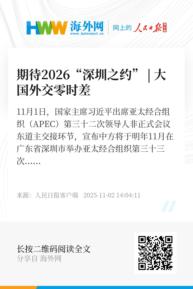 11月1日,国家主席习近平出席亚太经合组织(APEC)第三十二次领导人非正式会议东道主交接环节,宣布中方将于明年11月在广东省深圳市举办亚太经合组织第三十三次领导人非正式会议。