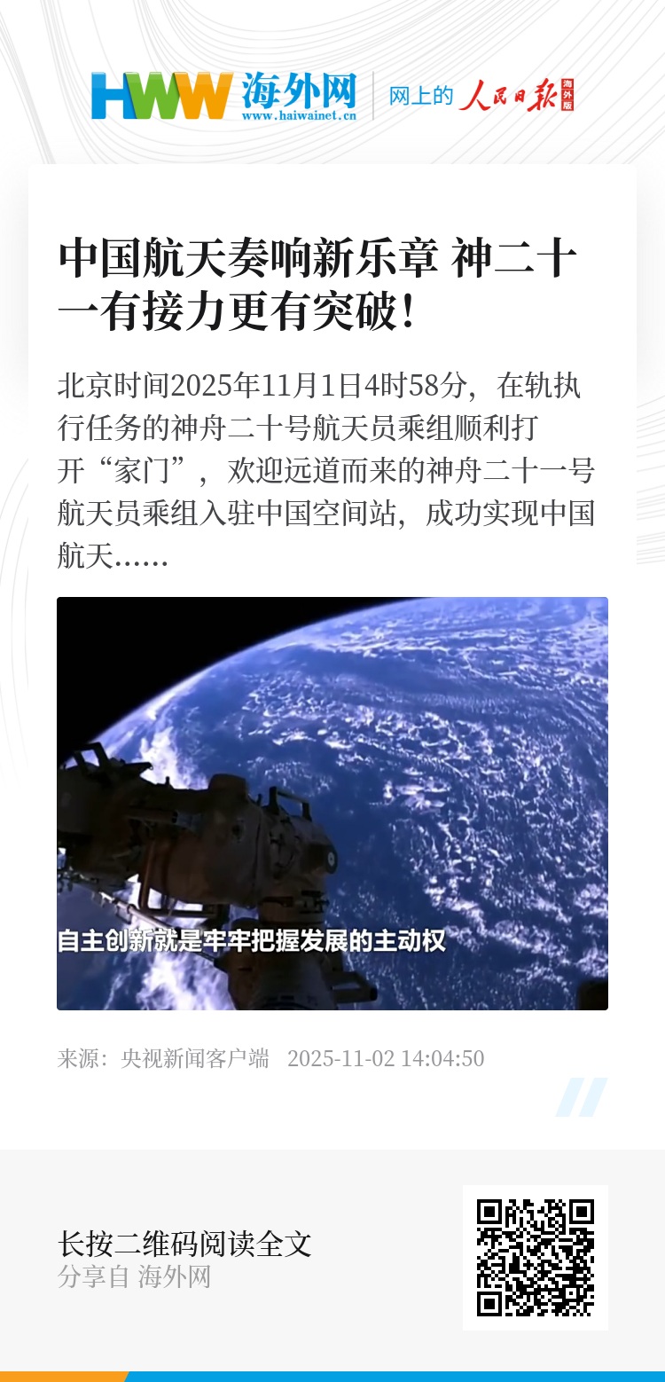 北京时间2025年11月1日4时58分,在轨执行任务的神舟二十号航天员乘组顺利打开“家门”,欢迎远道而来的神舟二十一号航天员乘组入驻中国空间站,成功实现中国航天史上第7次“太空会师”。神舟二十一号与中国空间站整个交会对接过程运行稳定、控制精准。这是我国载人飞船首次采用3.5小时交会对接方案,标志着我国载人航天自主快速交会对接技术实现又一突破。