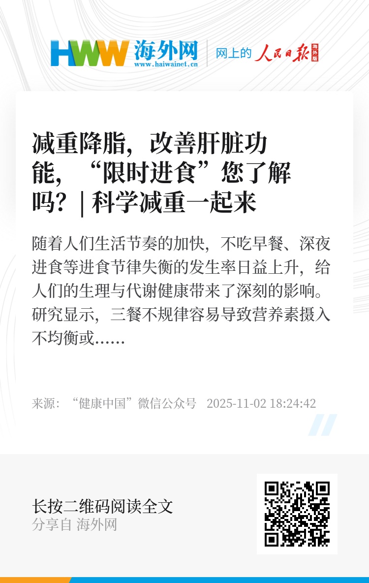 限时进食通过调整进食时间,使进食-禁食周期与人体昼夜节律一致,这一模式已被发现具有多种健康益处。在肥胖人群中,限时进食可显著降低体重、改善体脂;在代谢综合征患者中,限时进食可明显降低血压、改善血脂水平;在糖尿病及糖尿病高风险人群中,限时进食可改善胰岛素敏感性、降低空腹血糖水平、减轻胰岛素抵抗;在代谢相关脂肪性肝病人群中,限时进食显著减少了肝脏脂肪沉积,降低了体重和体脂肪,改善了肝脏功能。这些来自高质量临床干预研究的证据均表明,限时进食具有预防和管理肥胖、代谢综合征、2型糖尿病、脂肪肝等代谢紊乱疾病的潜能。