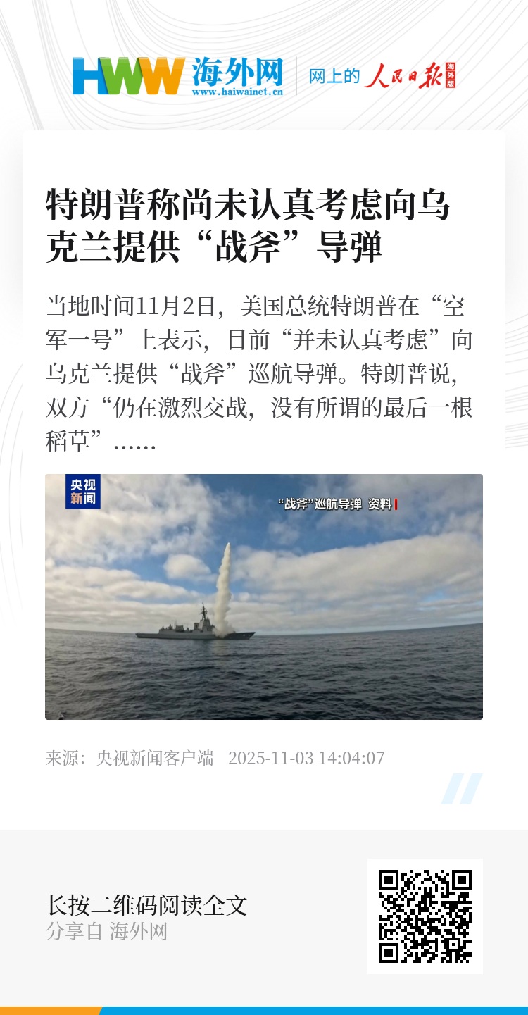 “战斧”巡航导弹最大射程超过2000公里,如果乌克兰获得这些导弹,俄罗斯首都莫斯科将进入其打击范围。此前,俄罗斯总统普京曾表示,即便美国向乌克兰提供“战斧”巡航导弹,也不会改变俄乌战场局势。(央视记者 许骁)