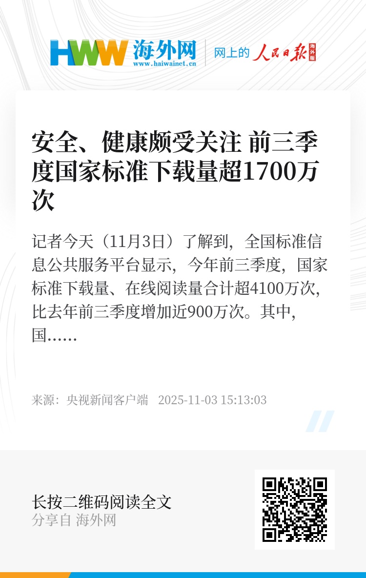 记者今天(11月3日)了解到,全国标准信息公共服务平台显示,今年前三季度,国家标准下载量、在线阅读量合计超4100万次,比去年前三季度增加近900万次。其中,国家标准下载量超1700万次,是去年前三季度下载量的10.9倍。