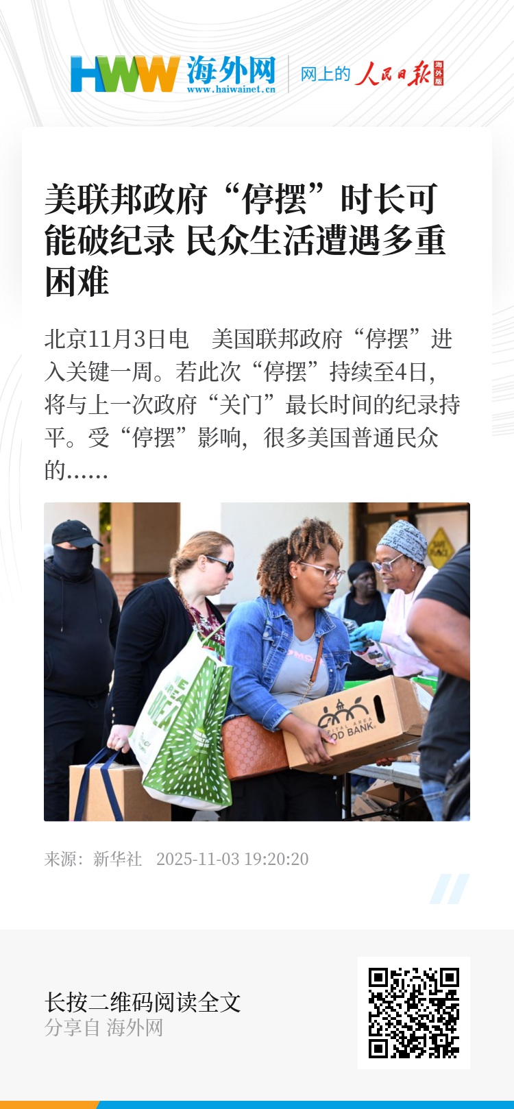 近日,美国多地的食品救济站和免费食物发放处前排起长队,前来领取食物的人明显多于以往。他们要么没有收到食品救济金,要么担心这笔钱未来会停发。还有一些人担心,救济金发放延迟会影响本月下旬的感恩节。