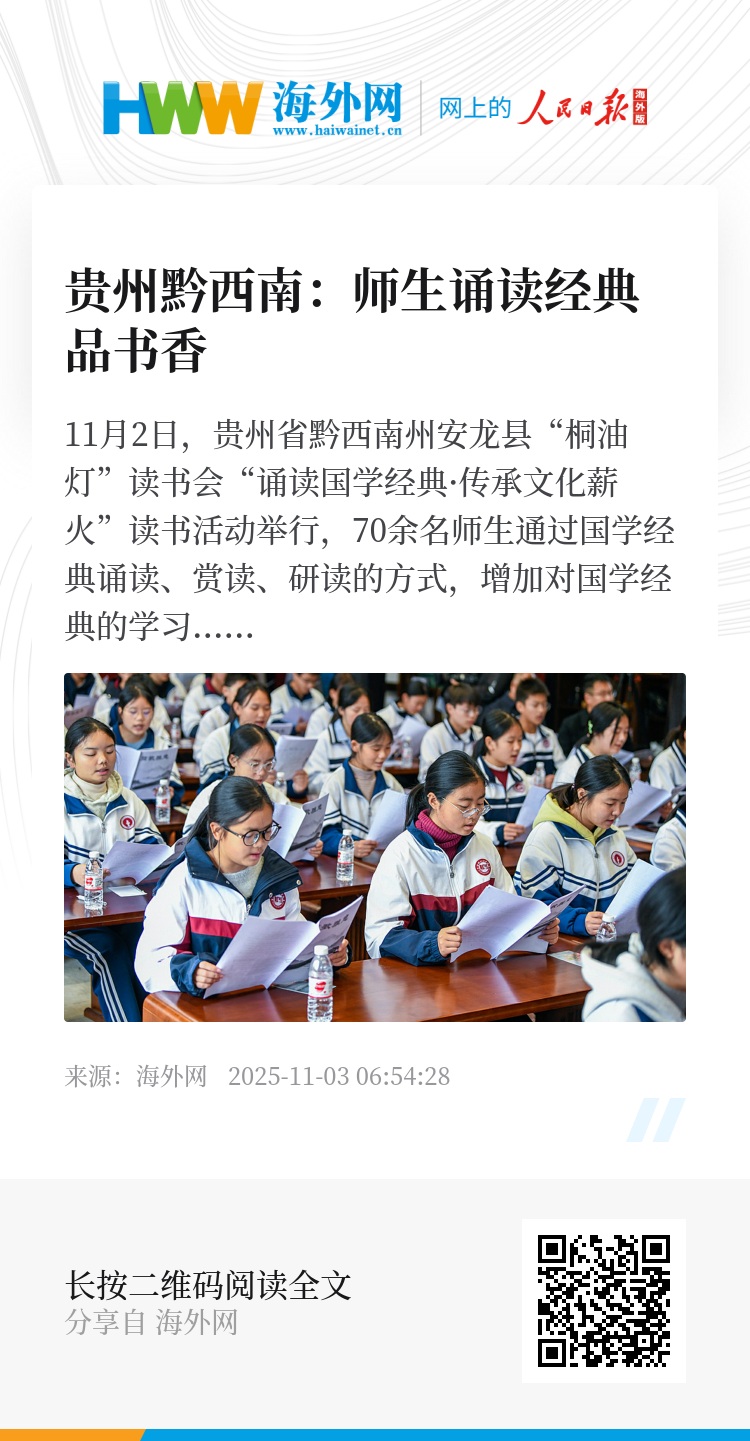 11月2日,贵州省黔西南州安龙县“桐油灯”读书会“诵读国学经典·传承文化薪火”读书活动举行,70余名师生通过国学经典诵读、赏读、研读的方式,增加对国学经典的学习兴趣,营造书香校园的文化氛围。图源:视觉中国