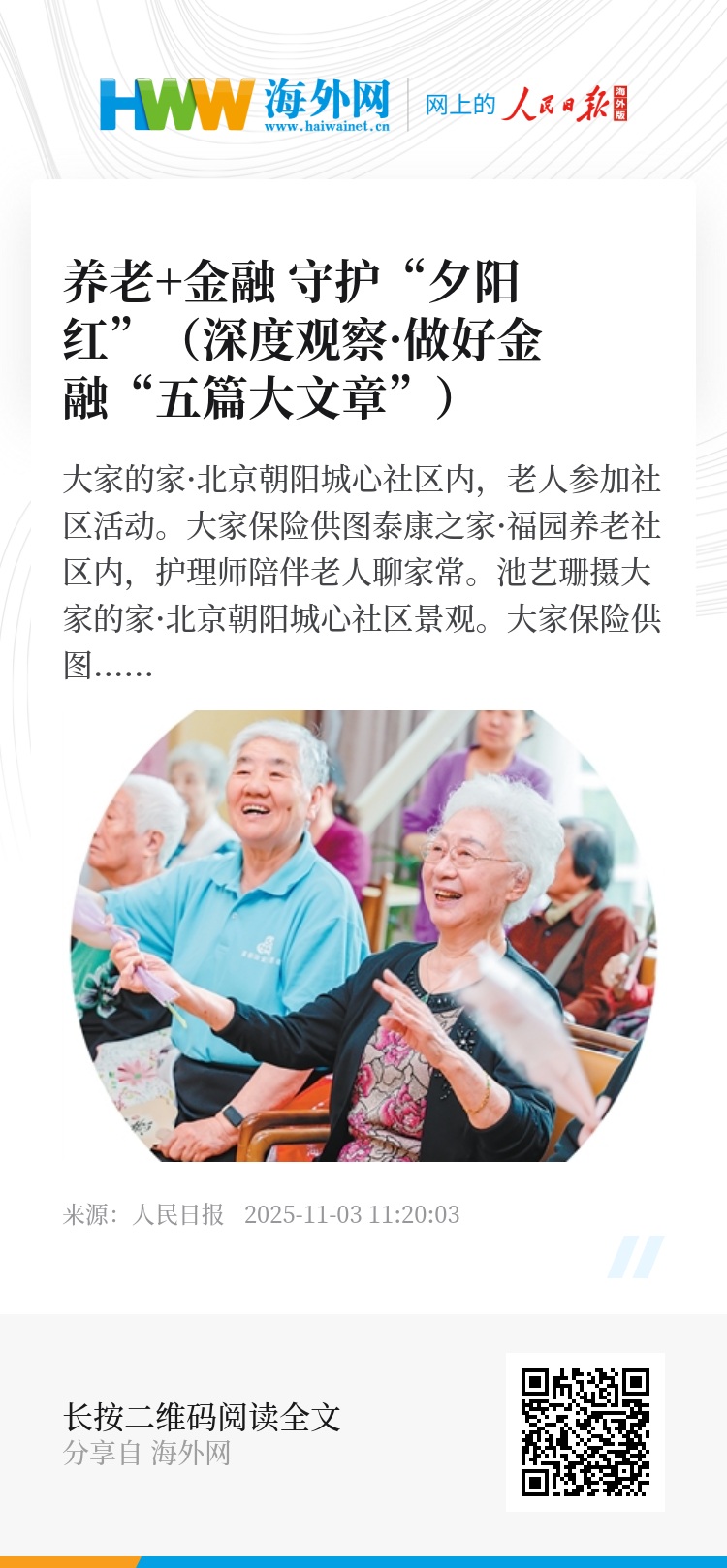 实现老有所养、老有所为、老有所乐,离不开高质量的养老事业和养老产业。推进基本养老服务体系建设,大力发展银发经济,金融发挥着重要作用。
