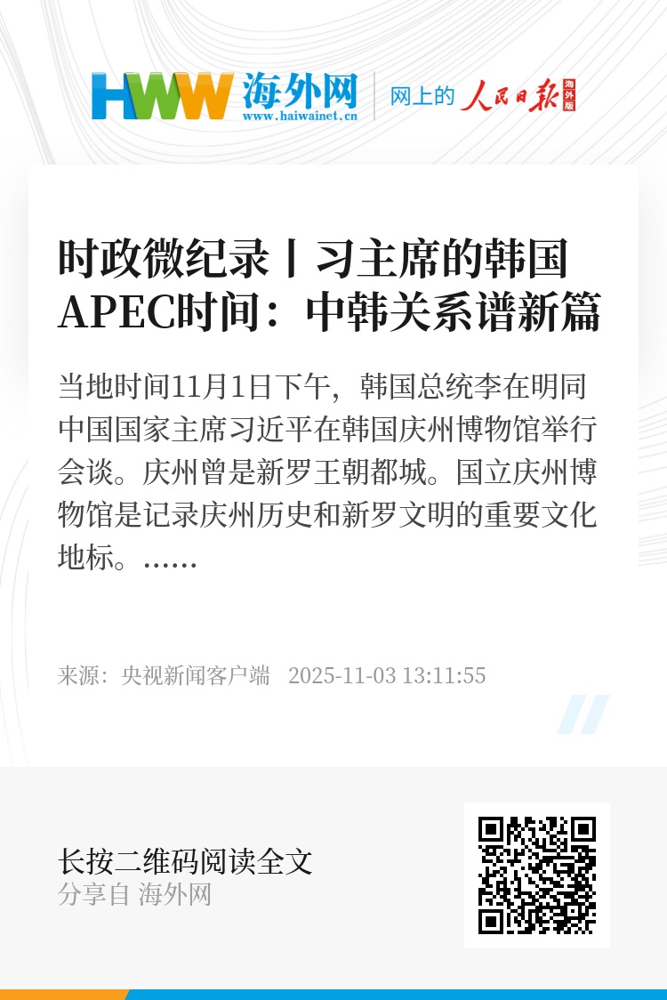当地时间11月1日下午,韩国总统李在明同中国国家主席习近平在韩国庆州博物馆举行会谈。