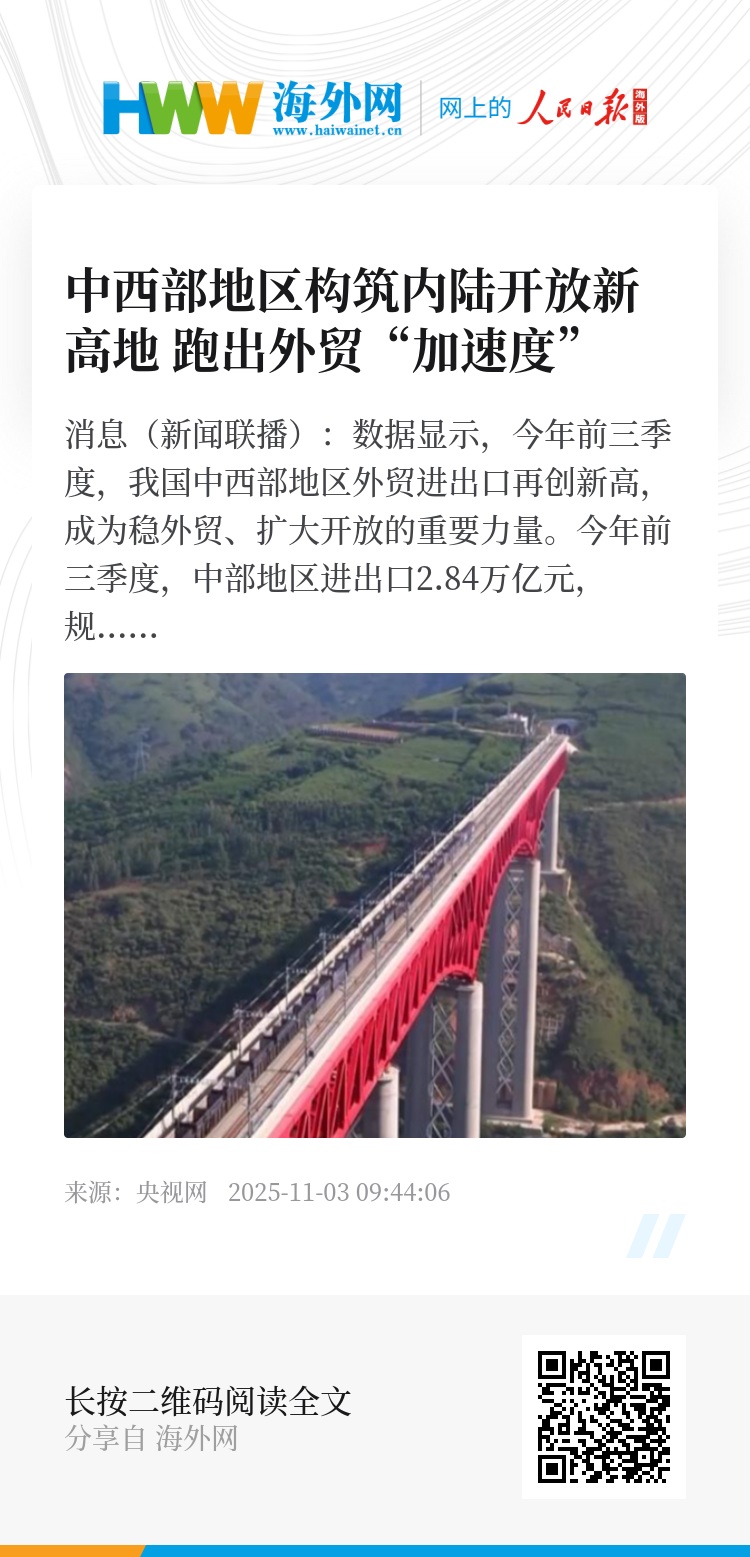 央视网消息(新闻联播):数据显示,今年前三季度,我国中西部地区外贸进出口再创新高,成为稳外贸、扩大开放的重要力量。