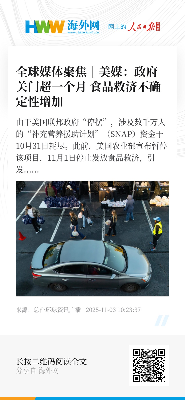 文章表示,美国政府原计划11月1日暂停向“补充营养援助计划”发放资金,但已被法官叫停。不过,资金发放的延迟仍可能导致数百万美国民众面临食品采购资金短缺的困境。