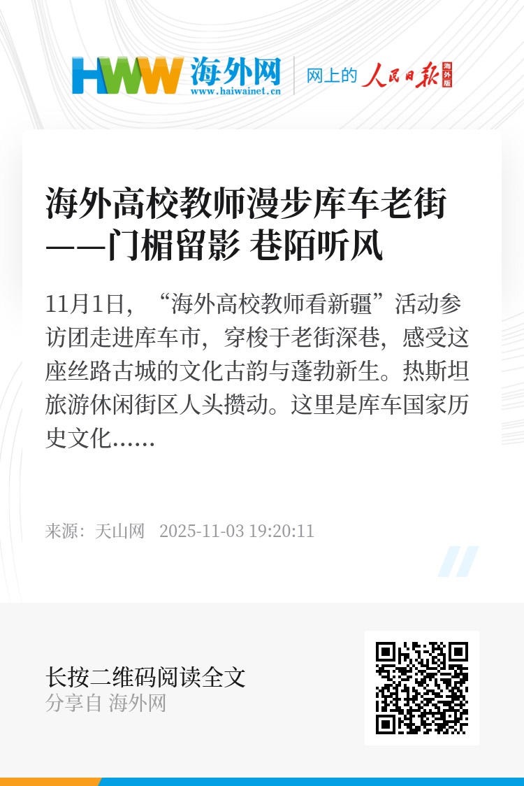 11月1日,“海外高校教师看新疆”活动参访团走进库车市,穿梭于老街深巷,感受这座丝路古城的文化古韵与蓬勃新生。