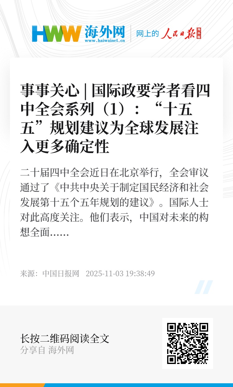 二十届四中全会近日在北京举行,全会审议通过了《中共中央关于制定国民经济和社会发展第十五个五年规划的建议》。国际人士对此高度关注。他们表示,中国对未来的构想全面而长远,五年规划不仅指引中国发展,也为全球发展注入更多确定性。