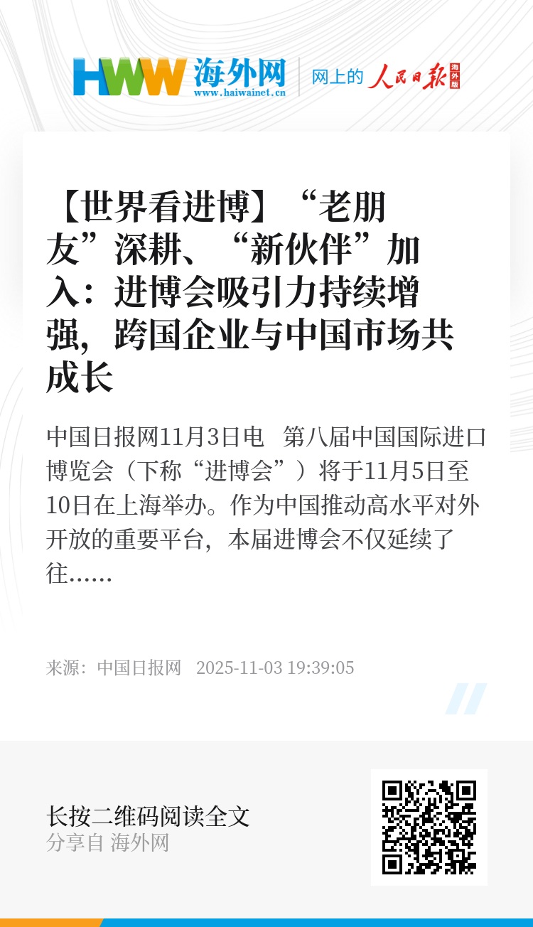 第八届进博会即将启幕,有“老朋友”的持续深耕,有“新伙伴”的踊跃加入,进博会正以开放的姿态、创新的活力,向全球企业敞开大门,成为中国高质量发展和高水平开放的生动写照,也为世界经济的复苏与发展注入强劲动力。