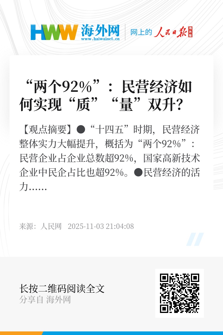 ●“十四五”时期,民营经济整体实力大幅提升,概括为“两个92%”:民营企业占企业总数超92%,国家高新技术企业中民企占比也超92%。