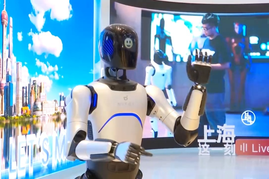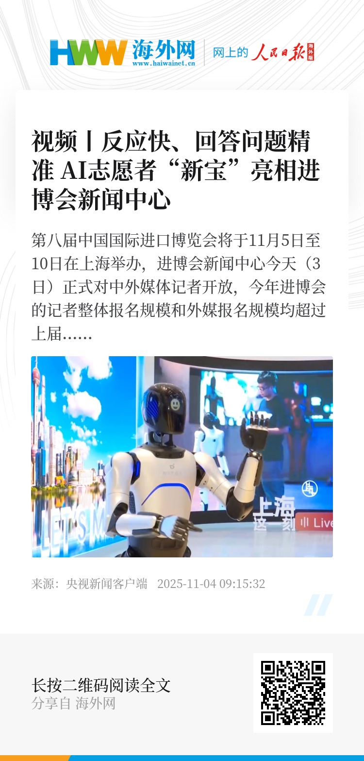 总台央视记者 王莉:这里是本届进博会的新闻中心,大家看我身边的这位特殊的工作人员是不是很吸睛呢?它就是本届进博会专门为中外记者量身打造的AI志愿者“新宝”,从今天起就在这里为大家服务。