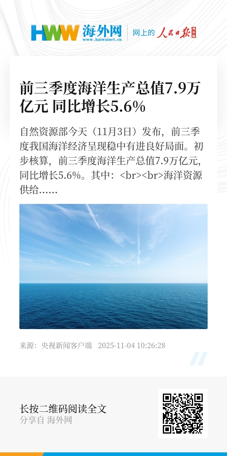 自然资源部今天(11月3日)发布,前三季度我国海洋经济呈现稳中有进良好局面。初步核算,前三季度海洋生产总值7.9万亿元,同比增长5.6%。其中: