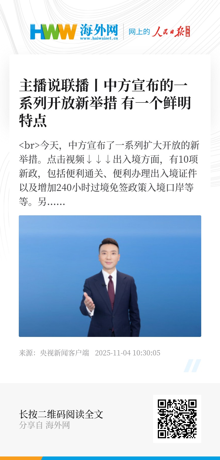 出入境方面,有10项新政,包括便利通关、便利办理出入境证件以及增加240小时过境免签政策入境口岸等等。另外,中方还决定对法国等国的免签政策延长至2026年12月31日,并将瑞典纳入免签范围,以及恢复旅行社经营中国公民赴加拿大团队游业务。这一系列举措有一个鲜明特点,就是自主开放,不仅方便中国公民出入境,也为境外人员来华创造更便利的条件。