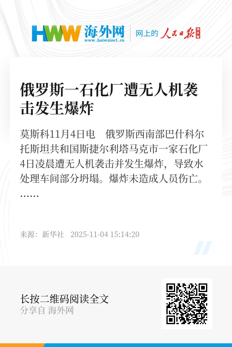 新华社莫斯科11月4日电 俄罗斯西南部巴什科尔托斯坦共和国斯捷尔利塔马克市一家石化厂4日凌晨遭无人机袭击并发生爆炸,导致水处理车间部分坍塌。爆炸未造成人员伤亡。