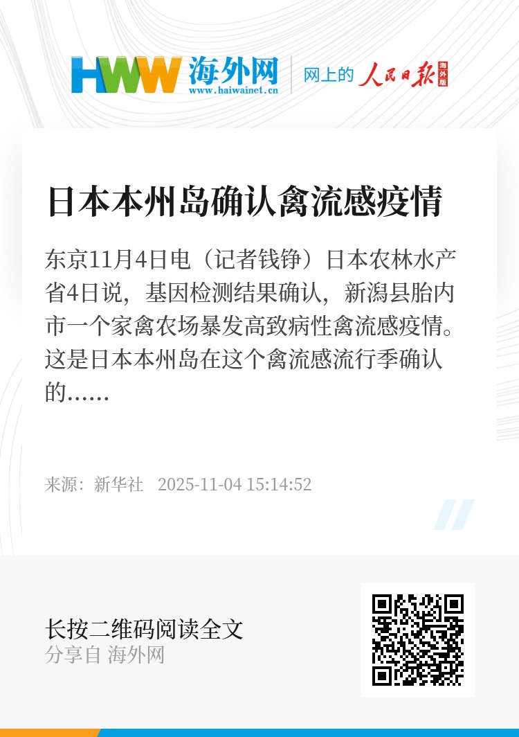 新华社东京11月4日电(记者钱铮)日本农林水产省4日说,基因检测结果确认,新潟县胎内市一个家禽农场暴发高致病性禽流感疫情。这是日本本州岛在这个禽流感流行季确认的首起疫情,也是日本全国第三起疫情。