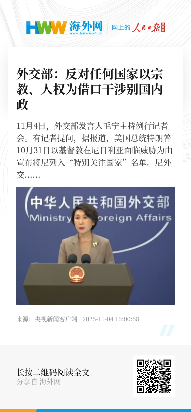 有记者提问,据报道,美国总统特朗普10月31日以基督教在尼日利亚面临威胁为由宣布将尼列入“特别关注国家”名单。尼外交部发表声明称,美方说法与事实不符。尼将继续打击暴力极端主义,保护公民,尊重宗教信仰和多元包容,遵守基于规则的国际秩序。特朗普11月1日称,如尼政府继续放任杀害基督徒行为,美将立即停止对尼一切援助,很有可能对尼采取军事行动,消灭伊斯兰恐怖分子。请问中方对此有何评论?