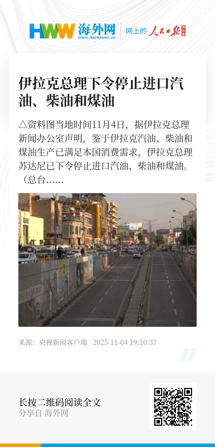 当地时间11月4日,据伊拉克总理新闻办公室声明,鉴于伊拉克汽油、柴油和煤油生产已满足本国消费需求,伊拉克总理苏达尼已下令停止进口汽油、柴油和煤油。(总台记者 米春泽)