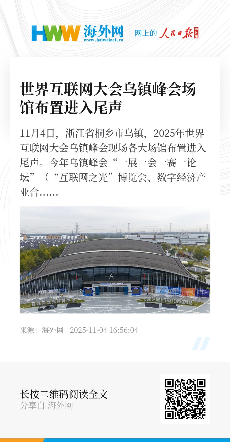 11月4日,浙江省桐乡市乌镇,2025年世界互联网大会乌镇峰会现场各大场馆布置进入尾声。今年乌镇峰会“一展一会一赛一论坛”(“互联网之光”博览会、数字经济产业合作大会、“直通乌镇”全球互联网大赛、人工智能引领科技创新和产业创新融合发展论坛)将继续聚焦“人工智能”这一时代新命题,开展对话与交流。图源:视觉中国