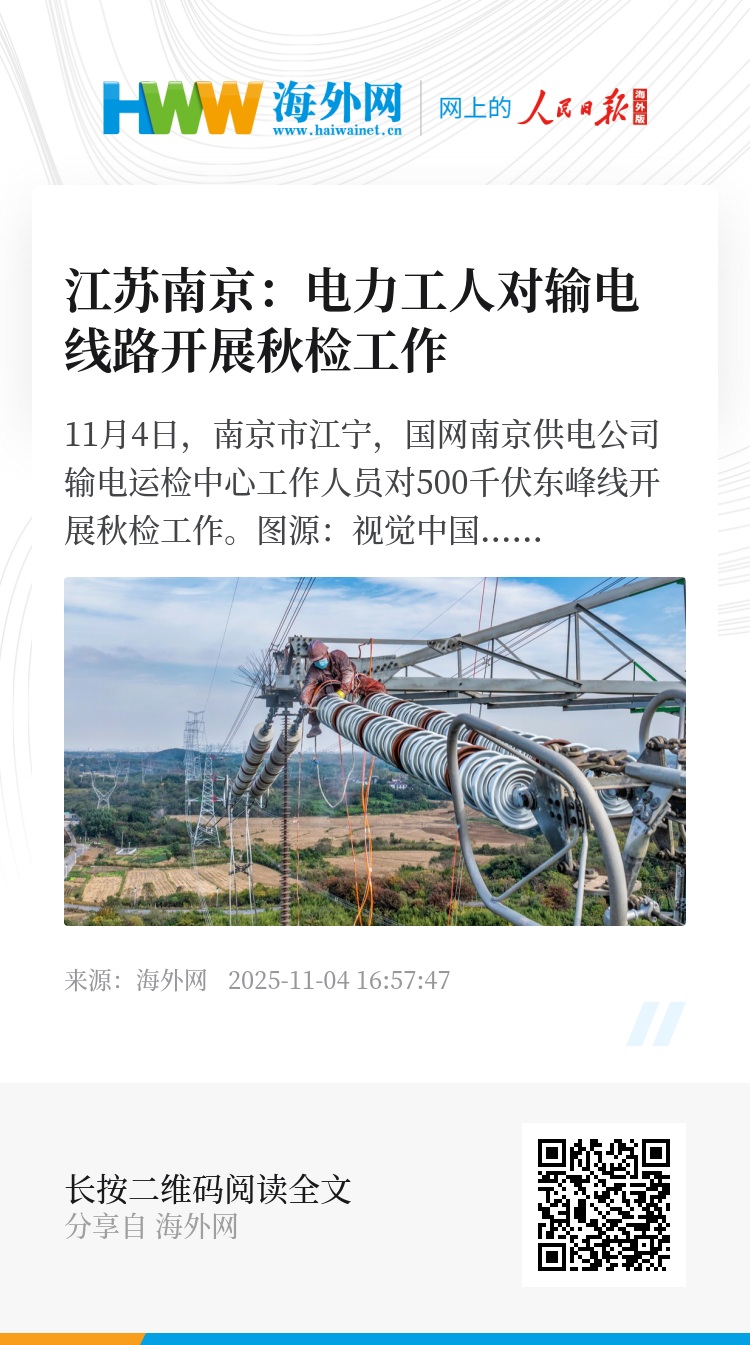 11月4日,南京市江宁,国网南京供电公司输电运检中心工作人员对500千伏东峰线开展秋检工作。图源:视觉中国