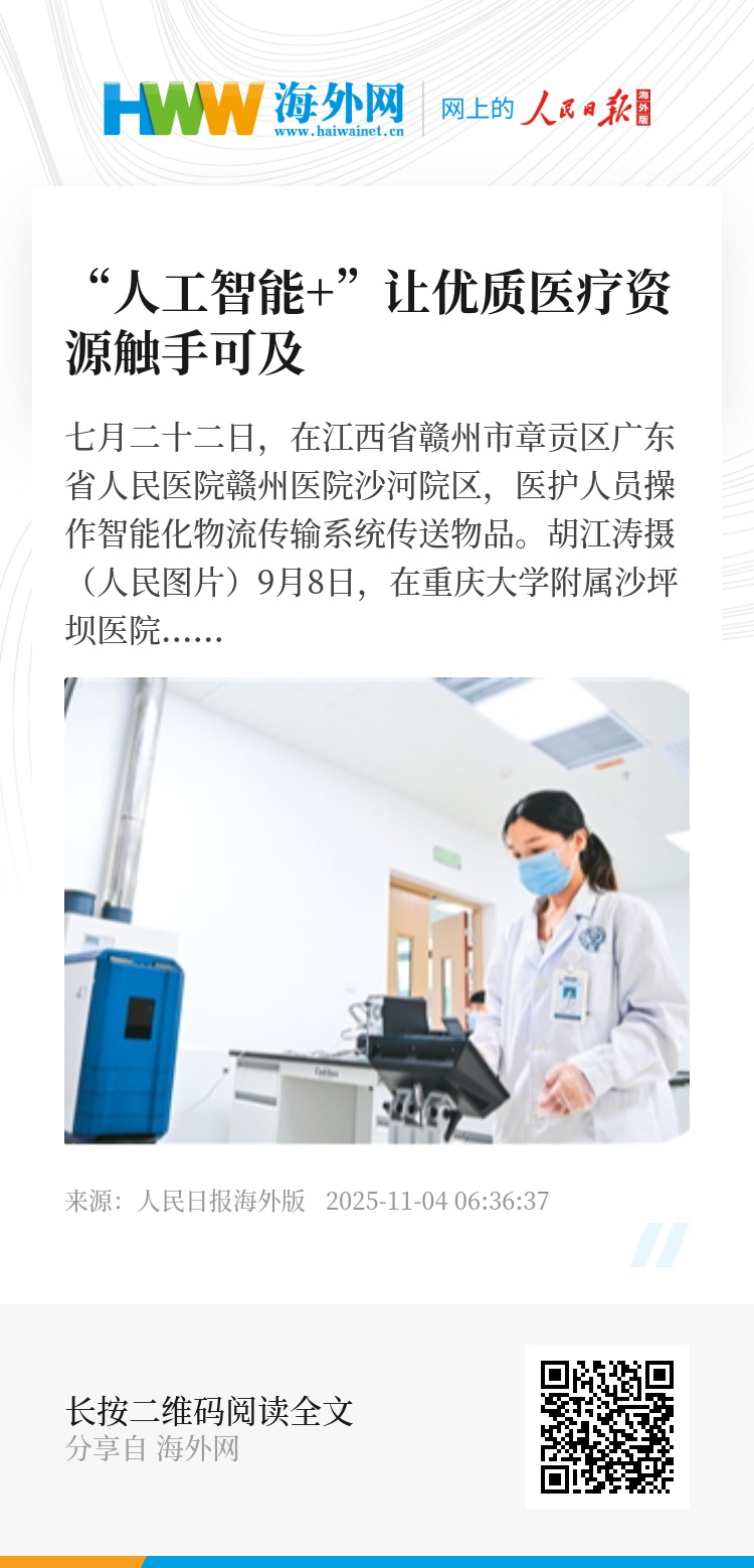 AI(人工智能)眼底相机快速筛查儿童眼疾、陪伴型机器人助力孤独症早筛、中医经络调理机器人精准按摩、医疗大模型提供全流程问诊、动态血糖监测系统实时预警、AI为慢病患者定制健康方案……近年来,随着AI推动数字医疗加速发展,从儿童到老人,从预防到治疗,“人工智能+”让优质医疗资源触手可及。