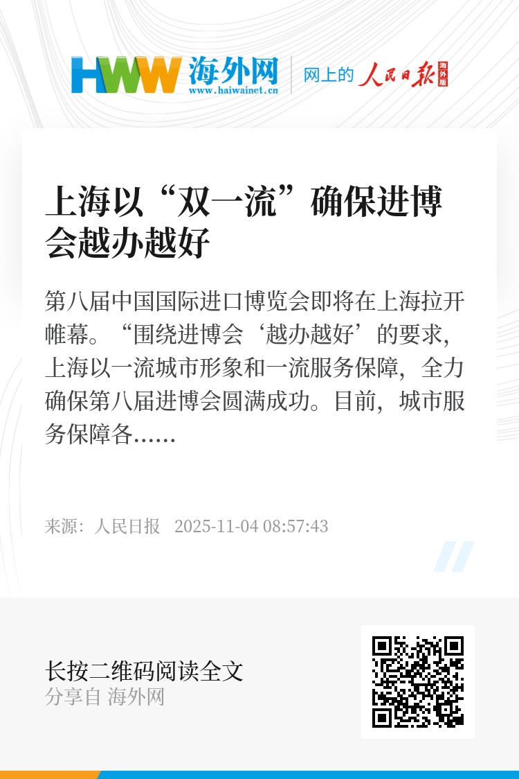 第八届中国国际进口博览会即将在上海拉开帷幕。“围绕进博会‘越办越好’的要求,上海以一流城市形象和一流服务保障,全力确保第八届进博会圆满成功。目前,城市服务保障各项准备工作已基本就绪。”上海市委常委、市委秘书长华源表示。