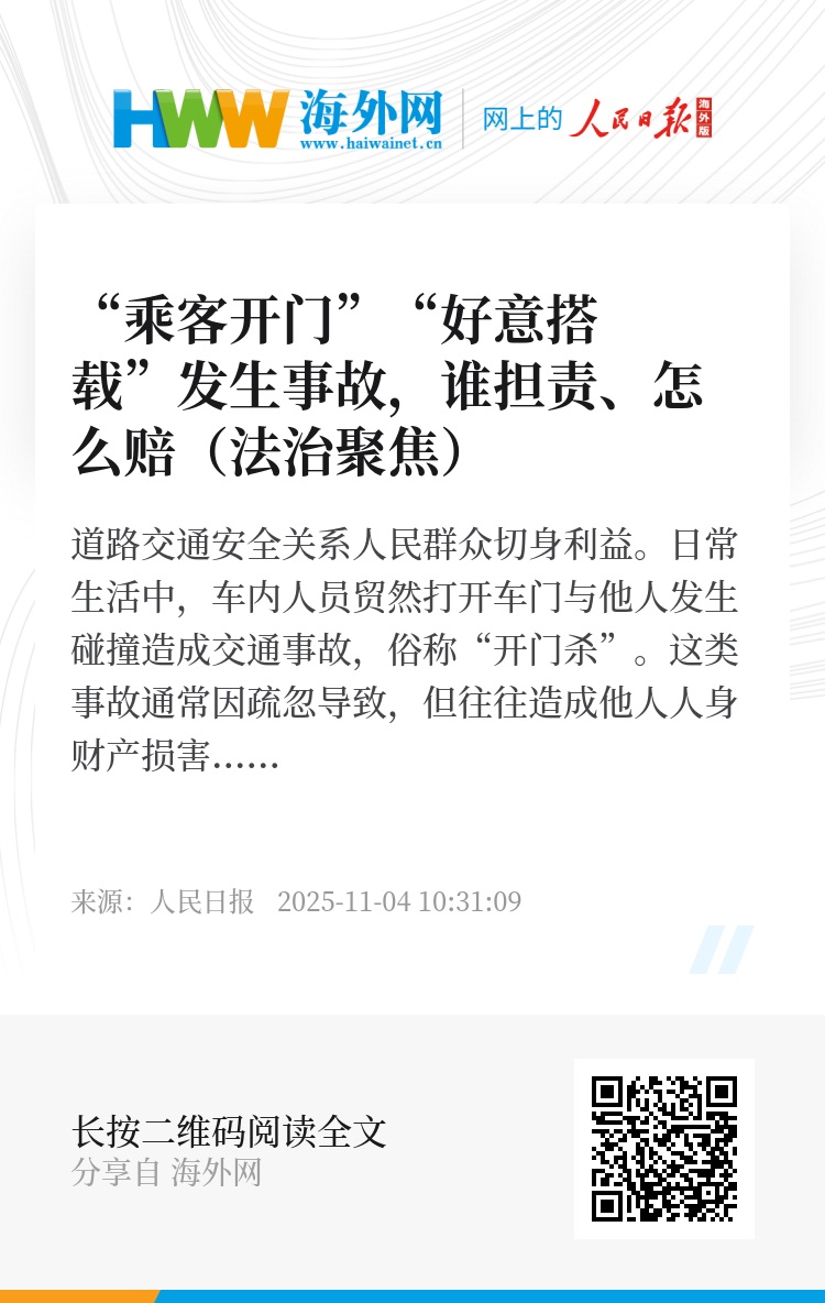 道路交通安全关系人民群众切身利益。日常生活中,车内人员贸然打开车门与他人发生碰撞造成交通事故,俗称“开门杀”。这类事故通常因疏忽导致,但往往造成他人人身财产损害,有些甚至引发人身伤亡等严重后果。