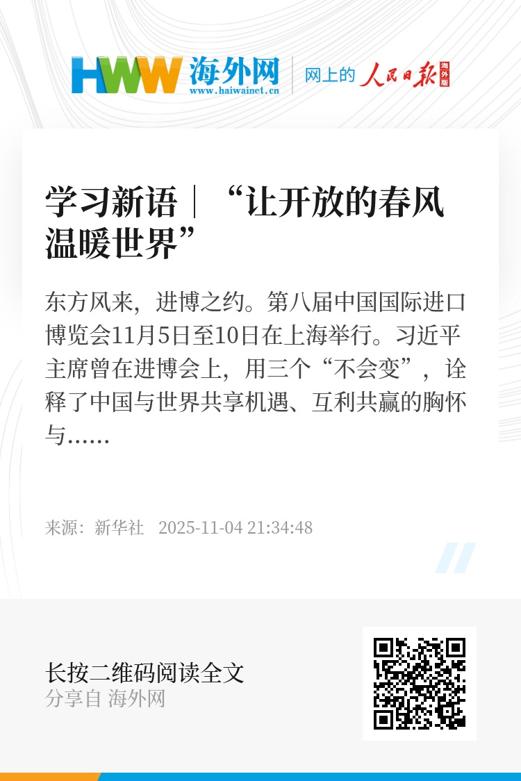 习近平主席曾在进博会上,用三个“不会变”,诠释了中国与世界共享机遇、互利共赢的胸怀与担当,展示了坚定不移的开放决心。进博之约向世界许下中国之诺:中国愿同各国一道,共建开放型世界经济,让开放的春风温暖世界!