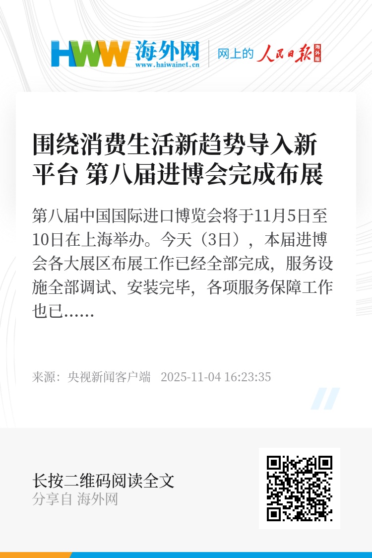 第八届中国国际进口博览会将于11月5日至10日在上海举办。今天(3日),本届进博会各大展区布展工作已经全部完成,服务设施全部调试、安装完毕,各项服务保障工作也已准备就绪。