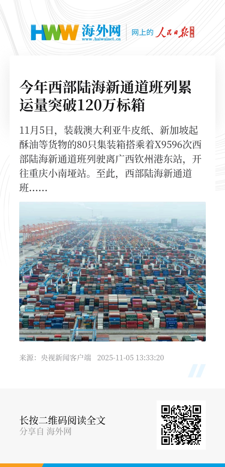 数据显示,“十四五”以来西部陆海新通道班列已累计发送集装箱货物444.1万标箱,成为连接中国西部地区与东盟国家,推动区域协调发展、深化对外开放的重要物流通道,为构建“陆海内外联动、东西双向互济”的开放格局搭建高效联动的桥梁。(总台记者 王洁)