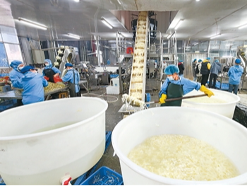 清洗、切分、腌制、装袋、杀菌……自动化设备高速运转,工人们有条不紊地忙碌着。经过加工,鲜笋变身清水笋、酸菜笋、泡椒笋等多样产品,不仅供应本地市场,还远销上海、广东等地。