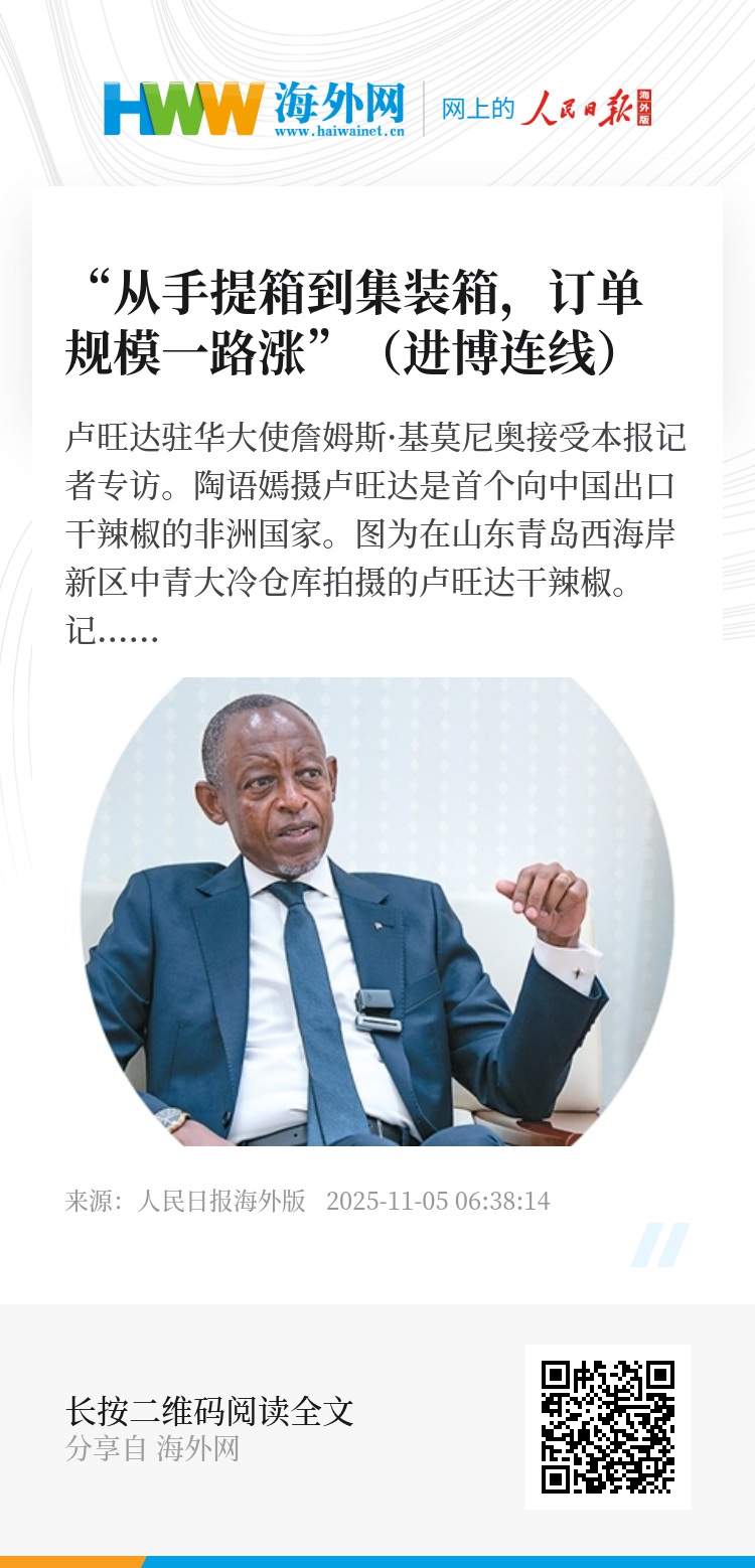 “我们的参展商,从最初拎着手提箱来推介样品,到如今通过集装箱进行出口,收获了实实在在的贸易增量。”在第八届中国国际进口博览会(以下简称“进博会”)开幕之际,卢旺达驻华大使詹姆斯·基莫尼奥接受本报专访,分享了他对进博会的观察。