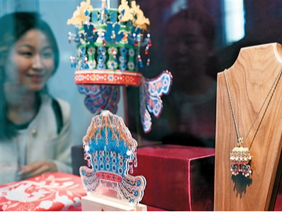 游客在中国国家博物馆选购文创产品“凤冠”项链。新华社记者 金良快摄