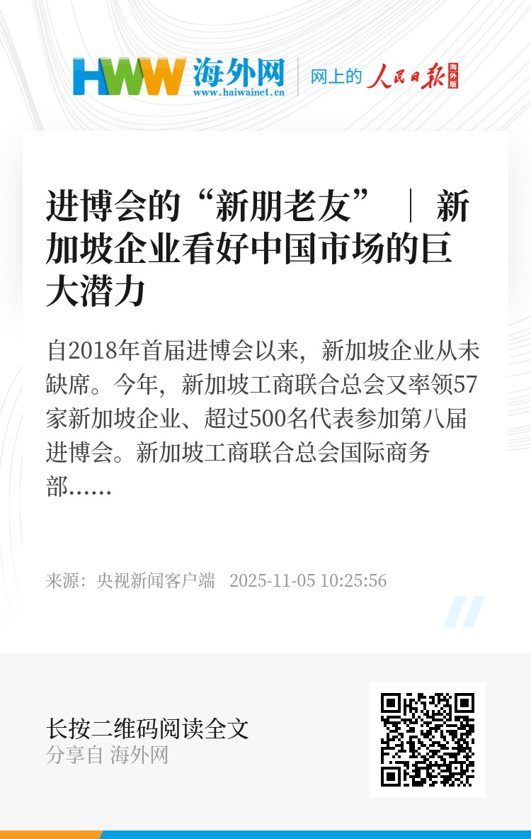 自2018年首届进博会以来,新加坡企业从未缺席。今年,新加坡工商联合总会又率领57家新加坡企业、超过500名代表参加第八届进博会。新加坡工商联合总会国际商务部执行总监苏炜杰表示,新加坡企业看好中国市场的巨大潜力,希望两国企业能够在数字经济、绿色经济领域展开更多合作。