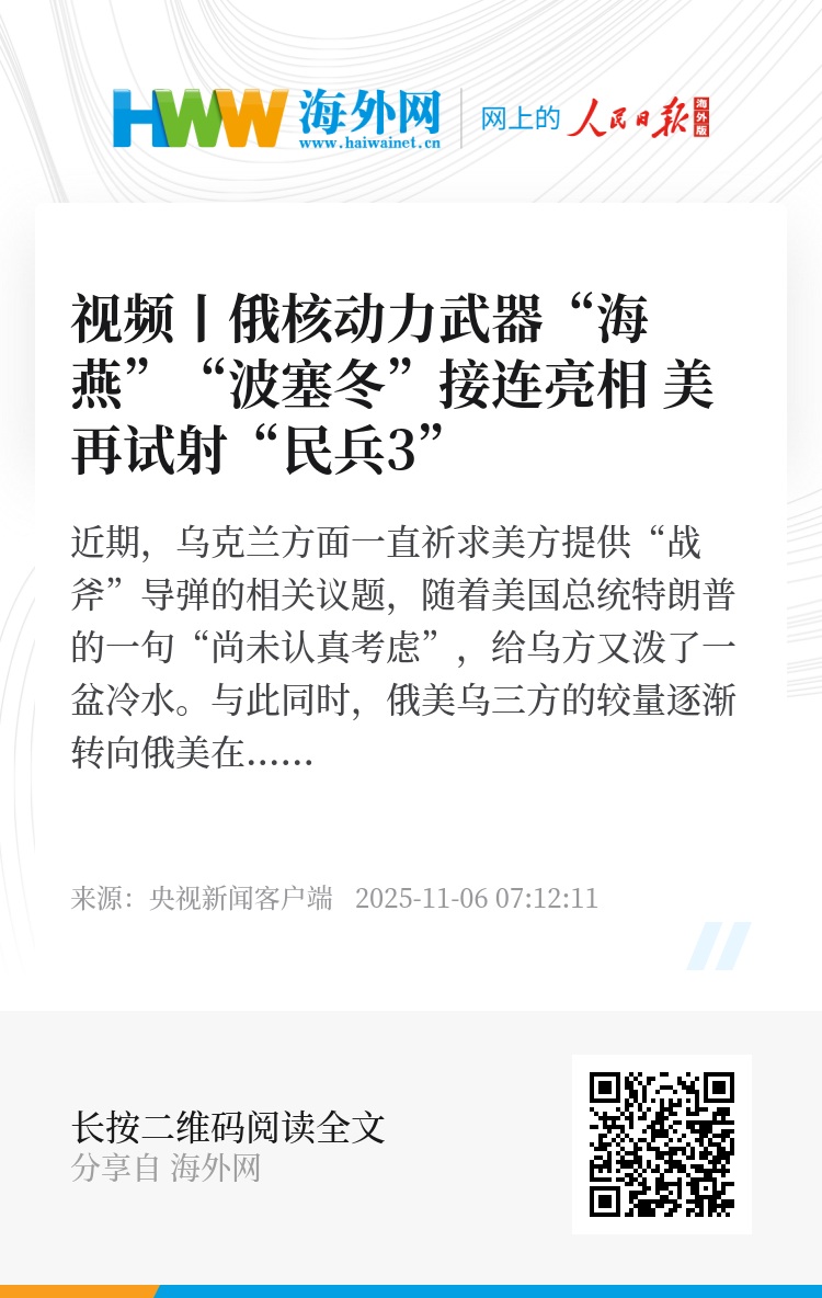 在俄方公布多款新型核动力武器后,特朗普紧接着宣布美国重启核试验。随后,在11月5日,美军试射可搭载核弹头的“民兵3”洲际弹道导弹。俄方同日召开联邦安全会议,就美重启核试验进行讨论。