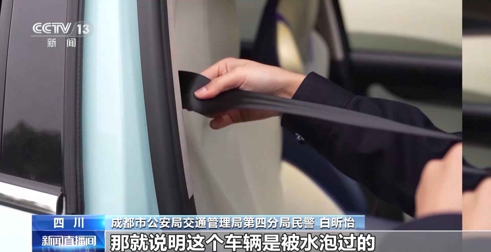 成都市公安局交通管理局第四分局民警 白昕怡:安全带的底部有一个标签,标签上的日期应该和我们车辆铭牌上的日期是相同的。如果两个日期不同,那就说明车辆的安全气囊被触发过,或者安全带被更换过。还有一个功能就是把安全带全部扯出来,如果底部有泥沙,就说明车辆是被水泡过的。