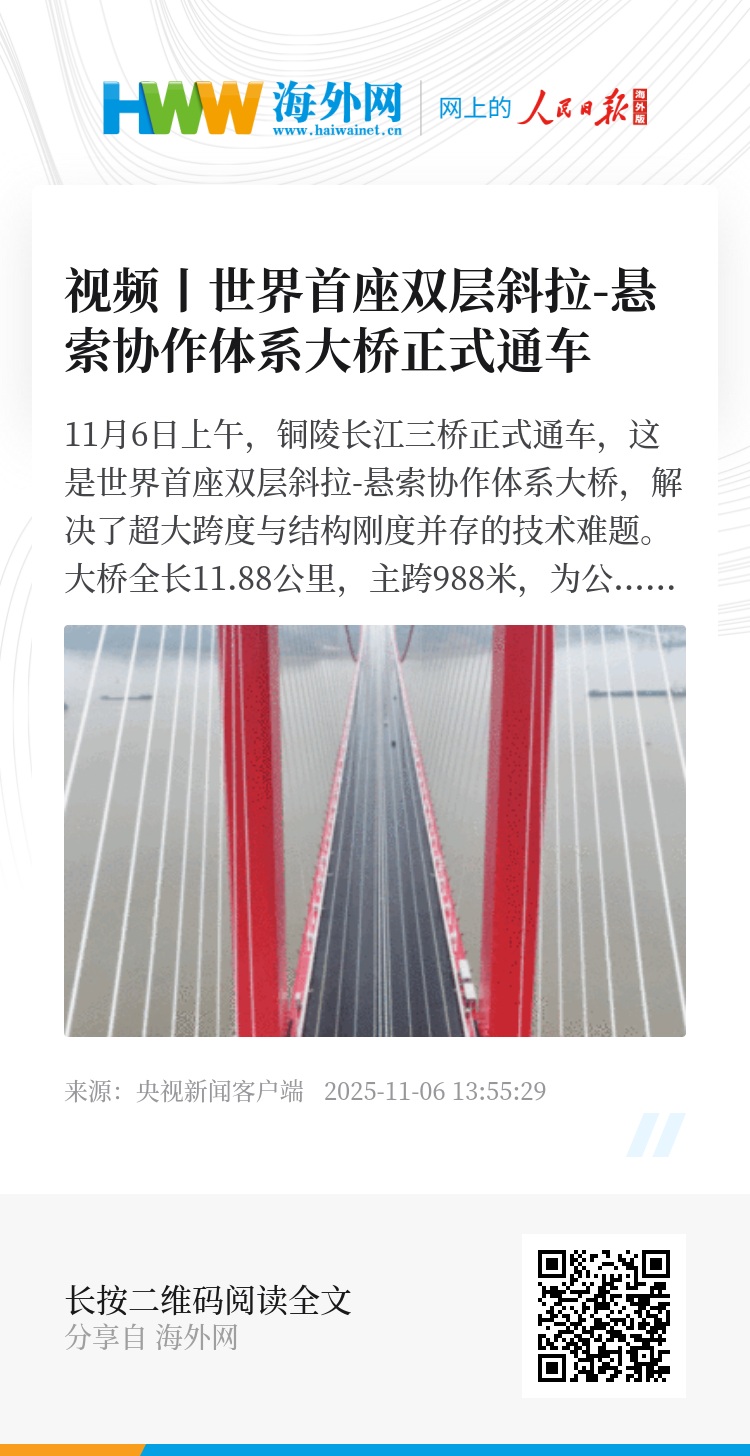 11月6日上午,铜陵长江三桥正式通车,这是世界首座双层斜拉-悬索协作体系大桥,解决了超大跨度与结构刚度并存的技术难题。