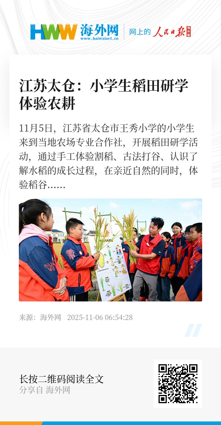 11月5日,江苏省太仓市王秀小学的小学生来到当地农场专业合作社,开展稻田研学活动,通过手工体验割稻、古法打谷、认识了解水稻的成长过程,在亲近自然的同时,体验稻谷丰收的喜悦和农耕文化的魅力。图源:视觉中国