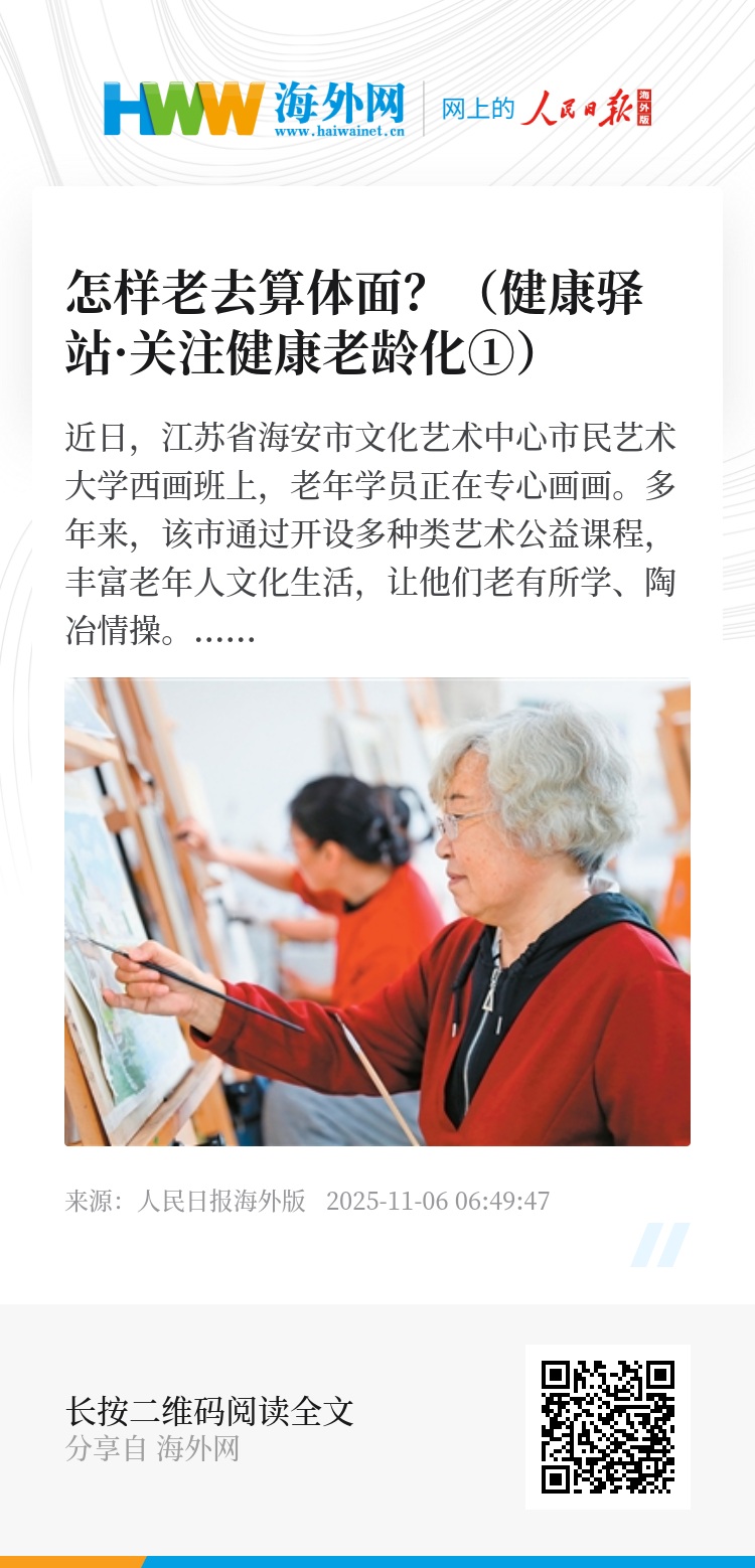 有尊严地老去,意味着在老年阶段仍然能为自己的人生做出选择——无论是身体活动、疾病管理、财务支配,还是医疗决策,甚至包括生命末期的选择,都有自主权,能够按照自己的意愿走完人生最后一段路。