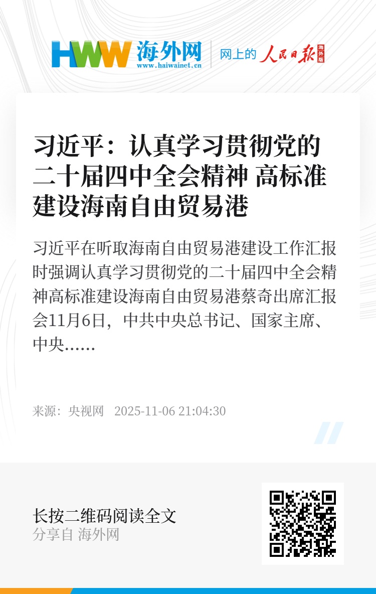中共中央总书记、国家主席、中央军委主席习近平在听取海南自由贸易港建设工作汇报时强调,建设海南自由贸易港,是党中央着眼新时代全面深化改革开放作出的重大决策。要认真学习贯彻党的二十届四中全会精神,在党中央集中统一领导下,各级各有关方面密切协作、主动作为,通过持续努力,全面实现海南自由贸易港建设目标。